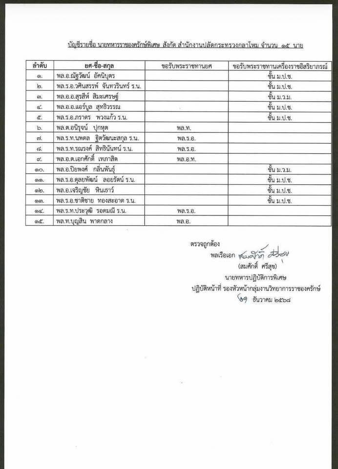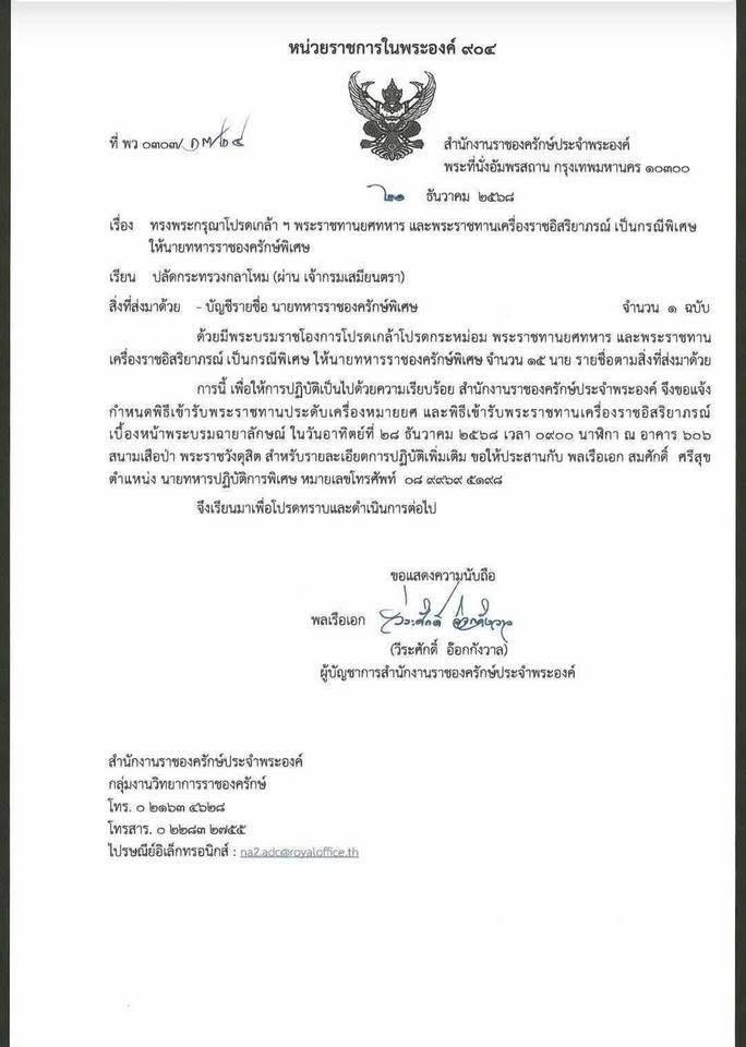 พระบาทสมเด็จพระเจ้าอยู่หัว ทรงพระกรุณาโปรดเกล้า ฯ พระราชทานยศทหาร และพระราชทานเครื่องราชอิสริยาภรณ์ เป็นกรณีพิเศษ ให้นายทหารราชองครักษ์พิเศษ 15 นาย