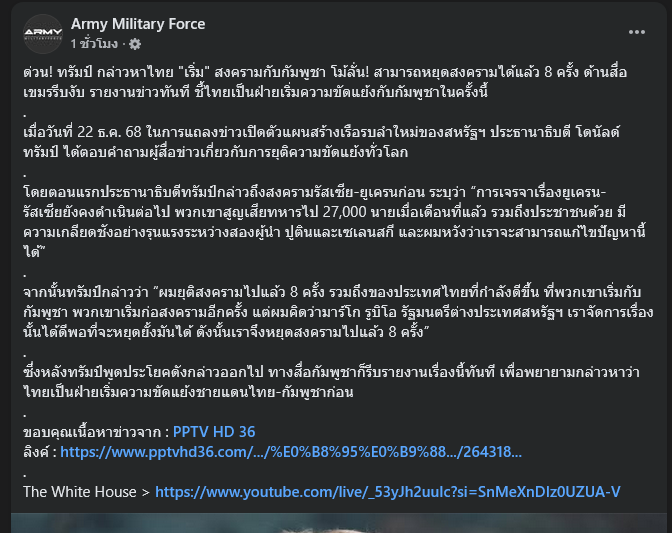 วันที่ 23 ธันวาคม 2568 เพจเฟซบุ๊ก Army Military Force ได้โพสต์ข้อความระบุว่า ด่วน! ทรัมป์ กล่าวหาไทย เริ่ม สงครามกับกัมพูชา โม้ลั่น สามารถหยุดสงครามได้แล้ว 8 ครั้ง ด้านสื่อเขมรรีบงับ รายงานข่าวทันที ชี้ไทยเป็นฝ่ายเริ่มความขัดแย้งกับกัมพูชาในครั้งนี้