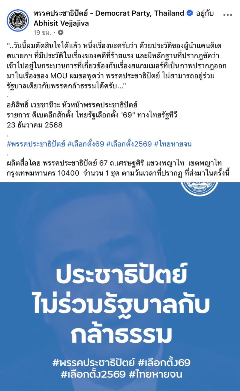 ล่าสุดเพจเฟซบุ๊ก พรรคประชาธิปัตย์ โพสต์คลิปวิดีโอเผยแพร่การให้สัมภาษณ์ของ นายอภิสิทธิ์ เวชชาชีวะ หัวหน้าพรรคประชาธิปัตย์ ว่า "วันนี้ผมตัดสินใจได้แล้วหนึ่งเรื่องนะครับ ว่าด้วยประวัติของผู้นำแคนดิเดตนายกฯ ที่มีประวัติในเรื่องของคดีที่ร้ายแรง และมีหลักฐานที่ปรากฏชัดว่าเข้าไปอยู่ในกระบวนการที่เกี่ยวข้องกับเรื่องสแกมเมอร์ที่เป็นภาพปรากฏออกมาในเรื่องของ MOU ผมขอพูดว่า พรรคประชาธิปัตย์ ไม่สามารถอยู่ร่วมรัฐบาลเดียวกับพรรคกล้าธรรมได้ครับ"