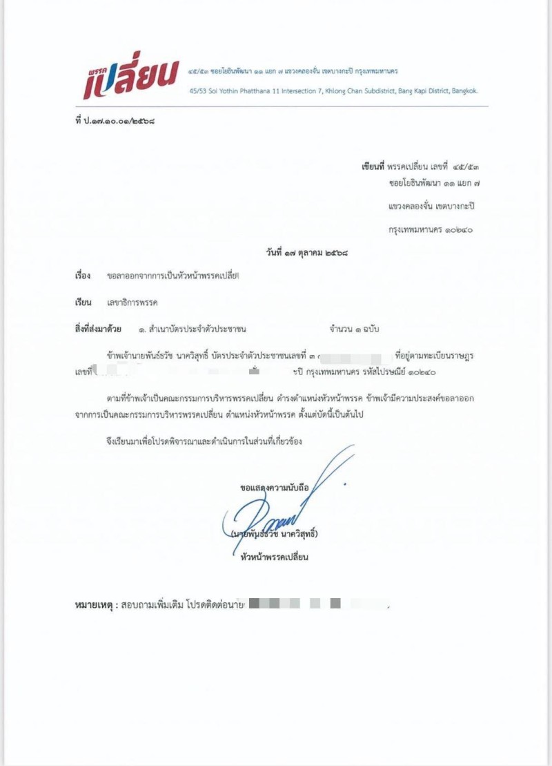 ในจดหมายระบุชื่อ นายพันธ์ธวัช นาควิสุทธิ์ พร้อมข้อมูลบัตรประจำตัวประชาชน และที่อยู่ตามทะเบียนราษฎร เลขที่ เขตบางกะปิ กรุงเทพมหานคร รหัสไปรษณีย์ 10240 โดยระบุว่า ขณะที่ดำรงตำแหน่งคณะกรรมการบริหารพรรคเปลี่ยน ในตำแหน่งหัวหน้าพรรค มีความประสงค์ขอลาออกจากการเป็นคณะกรรมการบริหารพรรคเปลี่ยน และจากตำแหน่งหัวหน้าพรรค นับตั้งแต่บัดนี้เป็นต้นไป