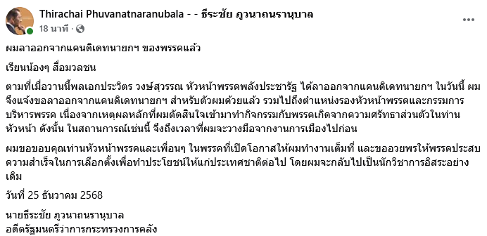 เมื่อวันที่ 25 ธันวาคม 2568 นายธีระชัย ภูวนาถนรานุบาล แคนดิเดทนายกฯ พรรคพลังประชารัฐ รองหัวหน้าพรรคพลังประชารัฐ และอดีตรัฐมนตรีว่าการกระทรวงการคลัง ได้ออกมาโพสต์ข้อความเเจ้งข่าวสาร ผ่านเฟซบุ๊กส่วนตัว Thirachai Phuvanatnaranubala - ธีระชัย ภูวนาถนรานุบาล โดยระบุว่า ผมลาออกจากแคนดิเดทนายกฯ ของพรรคแล้ว