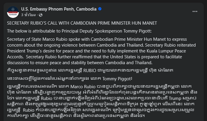 รัฐมนตรีว่าการกระทรวงการต่างประเทศ มาร์โก รูบิโอ ได้พูดคุยกับสมเด็จฯ ฮุน มาเนต นายกรัฐมนตรีกัมพูชา เพื่อแสดงความกังวลต่อความรุนแรงที่เกิดขึ้นอย่างต่อเนื่องระหว่างกัมพูชากับไทย รัฐมนตรีรูบิโอย้ำถึงความปรารถนาของประธานาธิบดีทรัมป์ต่อสันติภาพ และความจำเป็นในการปฏิบัติตาม “ข้อตกลงสันติภาพกัวลาลัมเปอร์” อย่างครบถ้วน นอกจากนี้ รัฐมนตรีรูบิโอยังยืนยันว่า สหรัฐอเมริกาพร้อมอำนวยความสะดวกในการหารือ เพื่อให้เกิดสันติภาพและเสถียรภาพระหว่างกัมพูชากับไทย