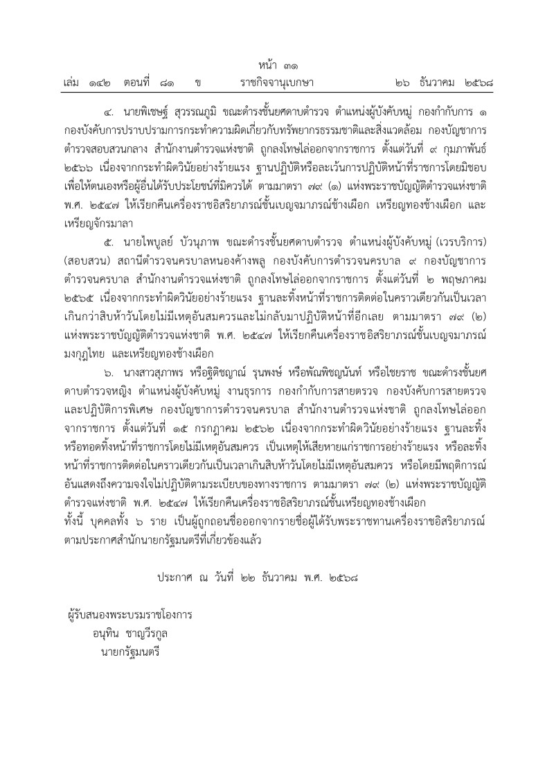 5. นายไพบูลย์ บัวนุภาพ ขณะดำรงขั้นยศดาบตำรวจ ตำแหน่งผู้บังคับหมู่ (เวรบริการ) (สอบสวน) สถานีตำรวจนครบาลหนองค้างพลู กองบังคับการตำรวจนครบาล 9 กองบัญชาการตำรวจนครบาล สำนักงานตำรวจแห่งชาติ ถูกลงโทษไล่ออกจากราชการ ตั้งแต่วันที่ 2 พฤษภาคม 2565 เนื่องจากกระทำผิดวินัยอย่างร้ายแรง ฐานละทิ้งหน้าที่ราชการติดต่อในคราวเดียวกันเป็นเวลาเกินกว่าสิบห้าวันโดยไม่มีเหตุอันสมควรและไม่กลับมาปฏิบัติหน้าที่อีกเลย ตามมาตรา 79 (2) แห่งพระราชบัญญัติตำรวจแห่งชาติ พ.ศ. 2547 ให้เรียกคืนเครื่องราชอิสริยาภรณ์ชั้นเบญจมาภรณ์มงกุฎไทย และเหรียญทองช้างเผือก