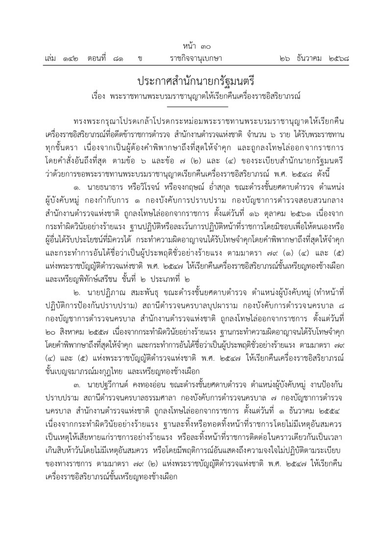 ทรงพระกรุณาโปรดเกล้าโปรดกระหม่อมพระราชทานพระบรมราชานุญาตให้เรียกคืนเครื่องราชอิสริยาภรณ์ที่อดีตข้าราชการตำรวจ สำนักงานตำรวจแห่งชาติ จำนวน 6 ราย ได้รับพระราชทานทุกชั้นตรา เนื่องจากเป็นผู้ต้องคำพิพากษาถึงที่สุดให้จำคุก และถูกลงโทษไล่ออกจากราชการ โดยคำสั่งอันถึงที่สุด ตามข้อ 6 และข้อ 7 (2) และ (4) ของระเบียบสำนักนายกรัฐมนตรีว่าด้วยการขอพระราชทานพระบรมราชานุญาตเรียกคืนเครื่องราชอิสริยาภรณ์ พ.ศ. 2558 ดังนี้