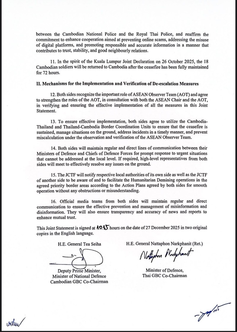 11. ตามปฏิญญาร่วมกัวลาลัมเปอร์ เมื่อวันที่ 26 ตุลาคม 2568 ทหารกัมพูชาจำนวน 18 นาย จะถูกส่งตัวกลับกัมพูชา หลังจากรักษาสถานะหยุดยิงครบ 72 ชั่วโมง