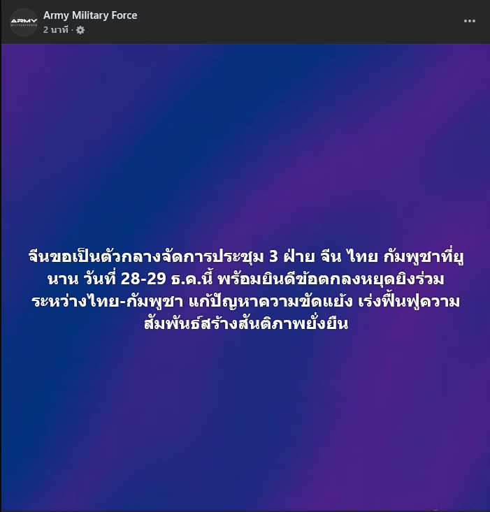 อย่างไรก็ตาม ด้านเพจ Army Military Force รายงานว่า จีนขอเป็นตัวกลางจัดการประชุม 3 ฝ่าย จีน ไทย กัมพูชาที่ยูนาน วันที่ 28-29 ธ.ค.นี้ พรัอมยินดีข้อตกลงหยุดยิงร่วมระหว่างไทย-กัมพูชา แก้ปัญหาความขัดแย้ง เร่งฟื้นฟูความสัมพันธ์สร้างสันติภาพยั่งยืน