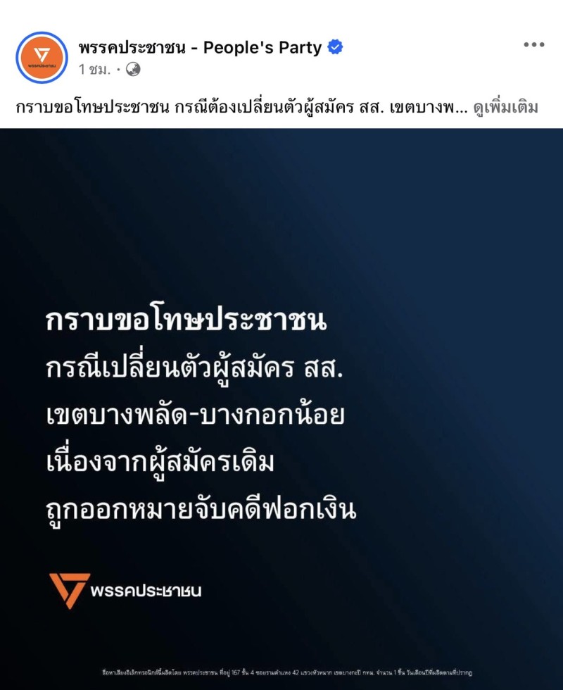 โดยพรรคประชาชน ก็ได้ชี้แจงผ่านเพจเฟสบุ๊ค พร้อมกล่าวขอโทษพี่น้องประชาชน โดยระบุว่า ก่อนหน้านี้พรรคได้ดำเนินกระบวนการคัดสรรผู้สมัครอย่างรอบคอบในทุกด้าน และไม่พบประวัติอาชญากรรมแต่อย่างใด