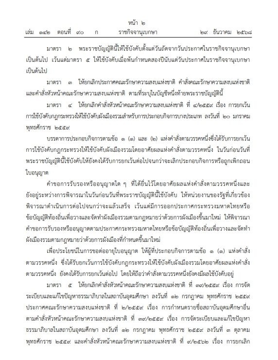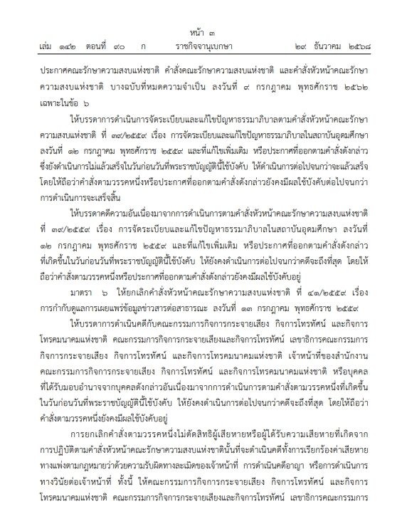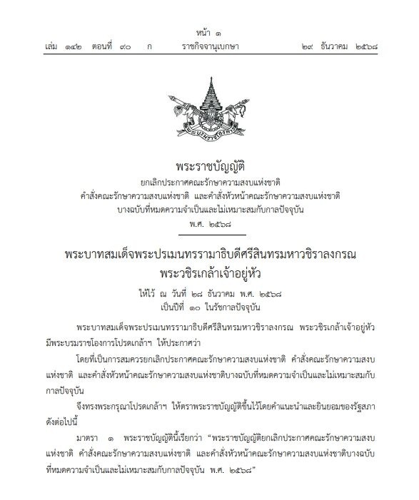 วันที่ 30 ธ.ค.2568 เว็บไซต์ ราชกิจจานุเบกษา เผยแพร่ พ.ร.บ.ยกเลิกประกาศคณะรักษาความสงบแห่งชาติ คำสั่งคณะรักษาความสงบแห่งชาติ และ คำสั่งหัวหน้าคณะรักษาความสงบแห่งชาติบางฉบับ ที่หมดความจำเป็นและไม่เหมาะกับกาลปัจจุบัน