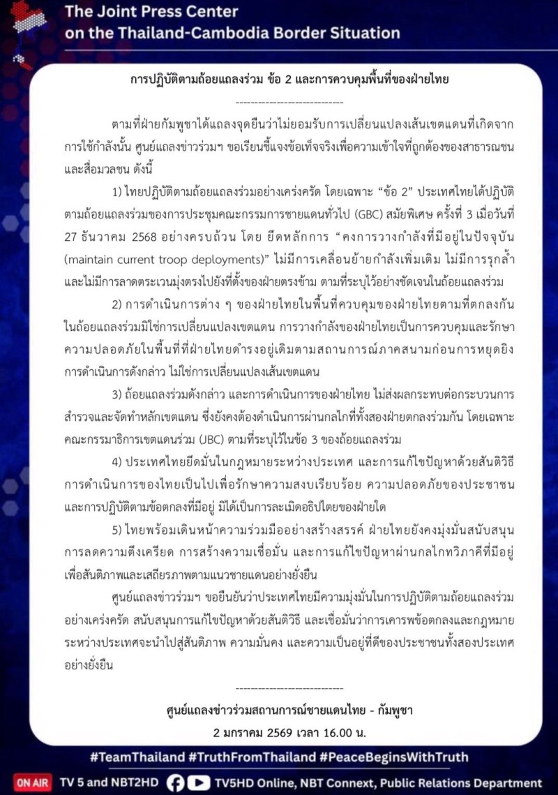 1. ไทยปฏิบัติตามถ้อยแถลงร่วมอย่างเคร่งครัด โดยเฉพาะ ข้อ 2 ประเทศไทยได้ปฏิบัติตามถ้อยแถลงร่วมของการประชุมคณะกรรมการชายแดนทั่วไป (GBC) สมัยพิเศษ ครั้งที่ 3 เมื่อวันที่ 27 ธ.ค.2568 อย่างครบถ้วน โดยยึดหลักการ คงการวางกำลังที่มีอยู่ในปัจจุบัน (maintain current troop deployments) ไม่มีการเคลื่อนย้ายกำลังเพิ่มเติม ไม่มีการรุกล้ำและไม่มีการลาดตระเวนมุ่งตรงไปยังที่ตั้งของฝ่ายตรงข้าม ตามที่ระบุไว้อย่างชัดเจนในถ้อยแถลงร่วม