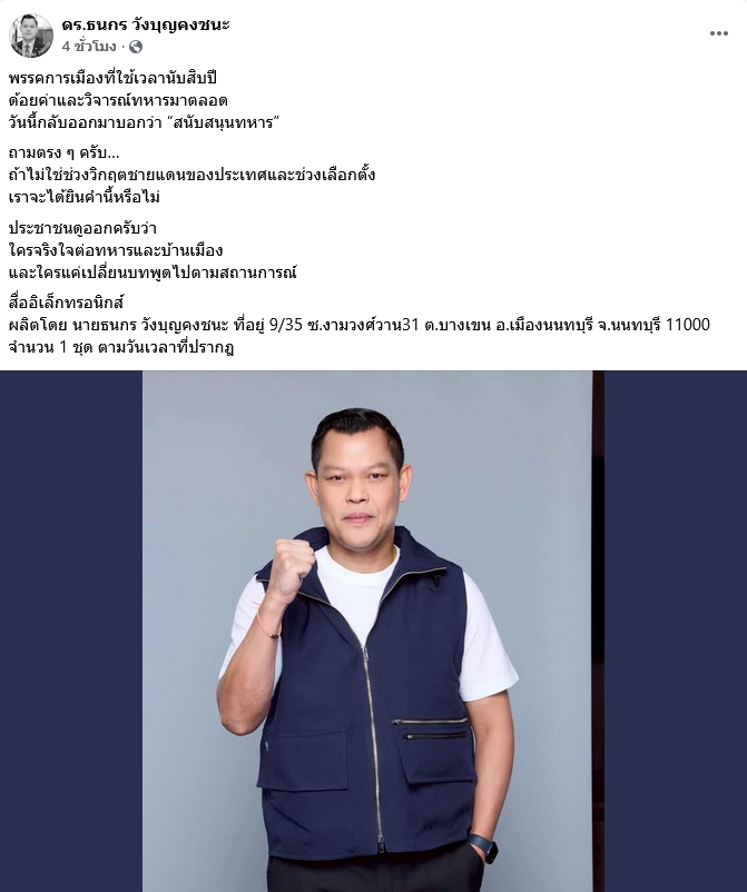 เมื่อวันที่ 3 มกราคม 2569 นายธนกร วังบุญคงชนะ รัฐมนตรีว่าการกระทรวงอุตสาหกรรม ในฐานะผู้สมัครรับเลือกตั้งสมาชิกสภาผู้แทนราษฎร บัญชีรายชื่อแกนนำพรรคภูมิใจไทย ได้อกมาเคลื่อนไหวด้วยการโพสต์รูปภาพพร้อมข้อความผ่านเฟซบุ๊กส่วนตัว ดร.ธนกร วังบุญคงชนะ โดยระบุว่า พรรคการเมืองที่ใช้เวลานับสิบปี ด้อยค่าและวิจารณ์ทหารมาตลอด วันนี้กลับออกมาบอกว่า สนับสนุนทหาร