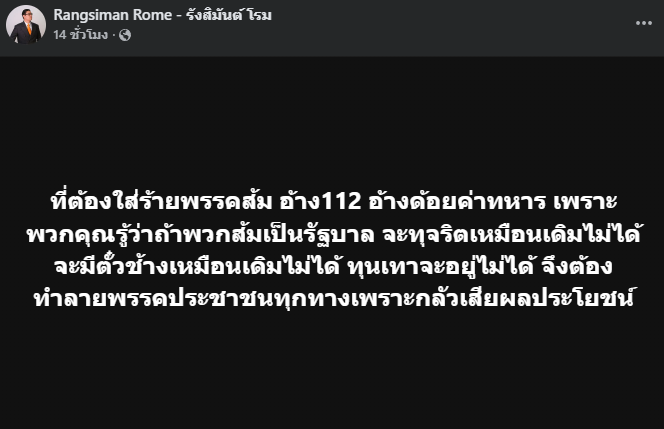 ที่ต้องใส่ร้ายพรรคส้ม อ้าง112 อ้างด้อยค่าทหาร เพราะ พวกคุณรู้ว่าถ้าพวกส้มเป็นรัฐบาล จะทุจริตเหมือนเดิมไม่ได้ จะมีตั๋วช้างเหมือนเดิมไม่ได้ ทุนเทาจะอยู่ไม่ได้ จึงต้องทำลายพรรคประชาชนทุกทางเพราะกลัวเสียผลประโยชน์