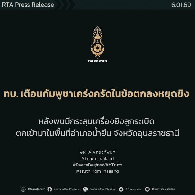 วันที่ 6 มกราคม 2569 มีรายงานว่า พลตรี วินธัย สุวารี โฆษกกองทัพบกเผยว่า เมื่อเวลา 07.40 น. ได้รับรายงานจากกองกำลังสุรนารี กองทัพภาคที่ 2 ได้ยินเสียงอาวุธไม่ทราบชนิดจากฝ่ายกัมพูชา จำนวน 1 นัด ยิงเข้ามาในเขตไทยบริเวณเนิน 469 อำเภอน้ำยืน จังหวัดอุบลราชธานี จากการตรวจสอบเพิ่มเติมพบว่าเป็นการยิงเครื่องยิงลูกระเบิดมาจากฝั่งกัมพูชา ส่งผลให้กำลังพลได้รับบาดเจ็บเล็กน้อยจากสะเก็ดระเบิด 1 นาย
