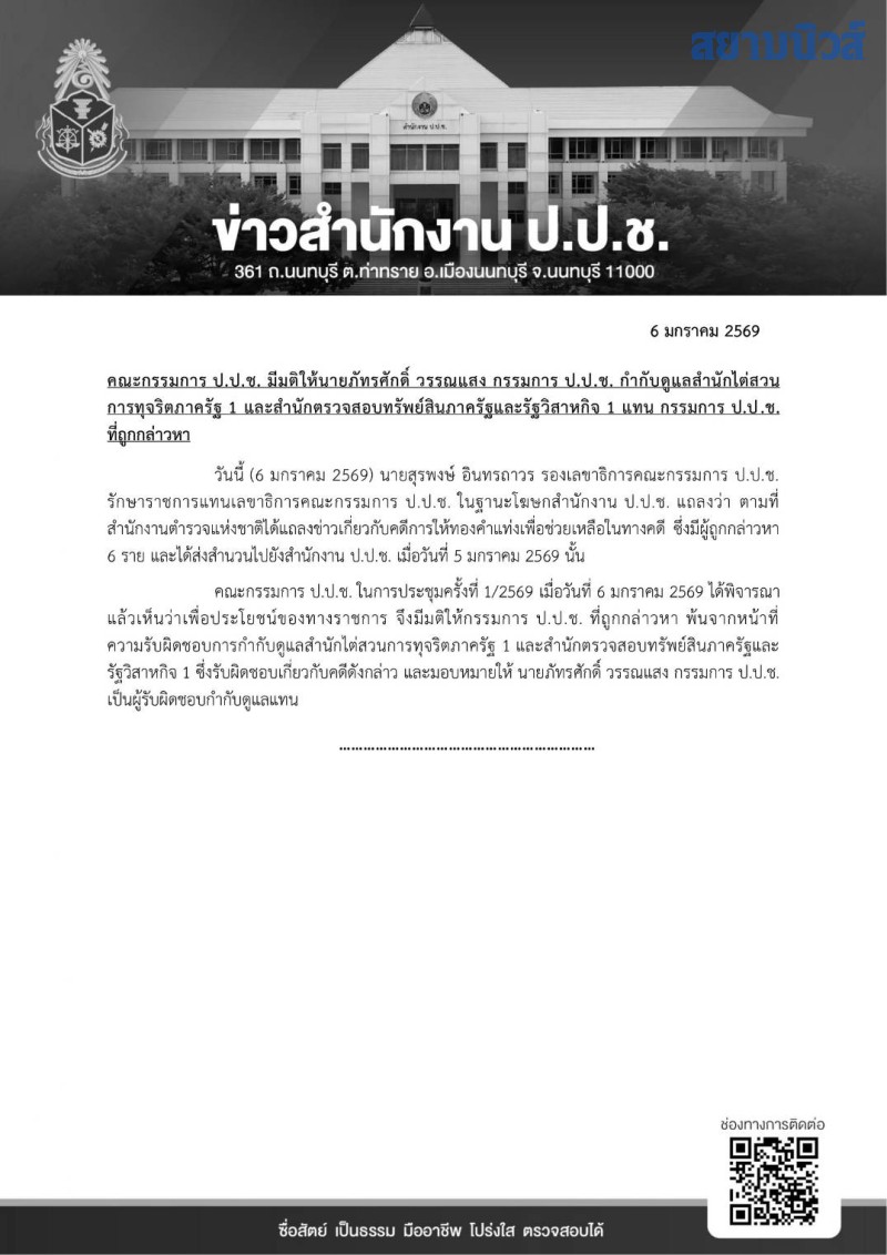 และมอบหมายให้ นายภัทรศักดิ์ วรรณแสง กรรมการ ป.ป.ช. เป็นผู้รับผิดชอบกำกับดูแลแทน