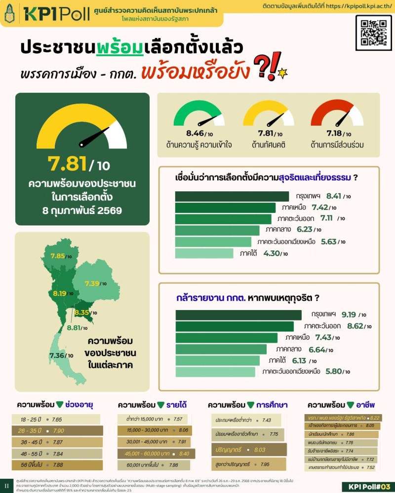 เมื่อวันที่ 9 มกราคม 2569 ที่ผ่านมา สถาบันพระปกเกล้า เปิดเผยผลสำรวจ เรื่อง ความพร้อมของประชาชนต่อการเลือกตั้ง 8 ก.พ. 69 โดย รองศาสตราจารย์ ดร.อิสระ เสรีวัฒนวุฒิ เลขาธิการสถาบันพระปกเกล้า ในฐานะประธานศูนย์ KPI Poll มอบนโยบายสำคัญในการทำ KPI Poll ให้เป็นโพลเชิงวิชาการที่ออกแบบมาเพื่อสะท้อนความจริงทางการเมืองด้วยความ “เป็นกลาง เป็นจริง เป็นประโยชน์” มีมาตรฐานวิชาการและความแม่นยำ ไม่มุ่งเน้นให้เกิดการชี้นำการเมือง แต่จัดทำเพื่อ “ฟัง”การเมืองจากเสียงของประชาชน โดยให้ข้อมูลจาก KPI Poll เป็นฐานความรู้สำคัญสำหรับนักการเมือง พรรคการเมือง นักวิชาการ และสาธารณชนในการทำความเข้าใจภูมิทัศน์ความรู้สึกและความคาดหวังของประชาชนอย่างรอบด้าน เพื่อทำหน้าที่เป็น “คลังสมองทางประชาธิปไตย” ของสังคมไทยอย่างแท้จริง