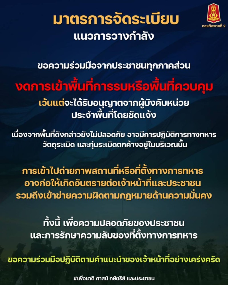 วันที่ 10 มกราคม 2569 ศูนย์ประชาสัมพันธ์กองทัพภาคที่ 2 ได้ออกประกาศมาตรการจัดระเบียบแนวการวางกำลัง ผ่านเพจเฟซบุ๊ก กองทัพภาคที่ 2 โดยระบุว่า ขอความร่วมมือจากประชาชนทุกภาคส่วน งดการเข้าพื้นที่การรบหรือพื้นที่ควบคุม เว้นแต่จะได้รับอนุญาตจากผู้บังคับหน่วยประจำพื้นที่โดยชัดแจ้ง