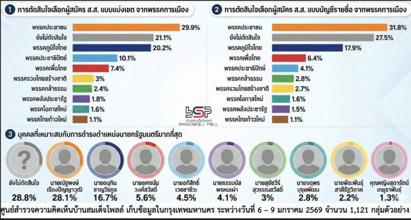 เมื่อไม่นานมานี้ ศูนย์สำรวจความคิดเห็นบ้านสมเด็จโพลล์ มหาวิทยาลัยราชภัฏบ้านสมเด็จเจ้าพระยา โดยผู้ช่วยศาสตราจารย์ ดร. สิงห์ สิงห์ขจร ประธานคณะกรรมการศูนย์สำรวจฯ ได้แถลงผลการสำรวจความคิดเห็นของประชาชนในกรุงเทพมหานคร เกี่ยวกับการเลือกตั้งสมาชิกสภาผู้แทนราษฎร (สส.) หลังเสร็จสิ้นการรับสมัคร โดยมีการเก็บข้อมูลจากกลุ่มตัวอย่าง 1,121 ราย ครอบคลุมทั้งเขตชั้นใน ชั้นกลาง และชั้นนอก ซึ่งผลสำรวจครั้งนี้สะท้อนถึงแรงกระเพื่อมทางการเมืองที่น่าสนใจอย่างยิ่งก่อนถึงวันเลือกตั้งจริงในวันอาทิตย์ที่ 8 กุมภาพันธ์ 2569