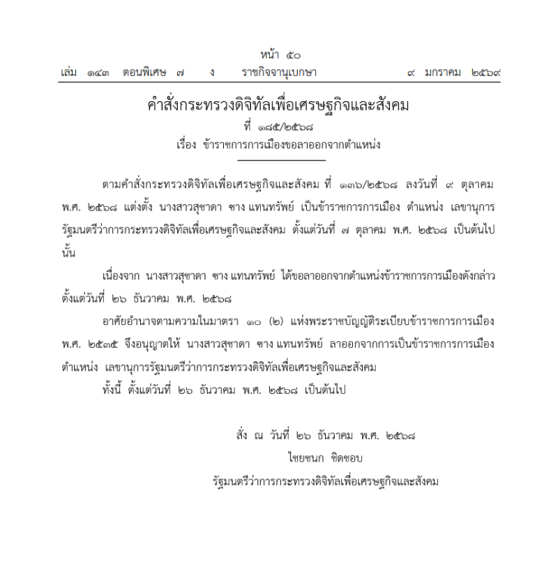วันที่ 11 มกราคม 2569 มีรายงานว่า เว็บไซต์ ราชกิจจานุเบกษา เผยเเพร่ประกาศ คำสั่งกระทรวงดิจิทัลเพื่อเศรษฐกิจและสังคม ที่ 185/2568 เรื่อง ข้าราชการการเมืองขอลาออกจากตำแหน่ง