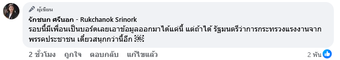 ก่อนจะรุบุในคอมเมนต์ใต้โพสต์ดังกล่าวอีกว่า รอบนี้มีเพื่อนเป็นบอร์ดเลยเอาข้อมูลออกมาได้แค่นี้ แต่ถ้าได้ รัฐมนตรีว่าการกระทรวงแรงงานจากพรรคประชาชน เดี๋ยวสนุกกว่านี้อีก