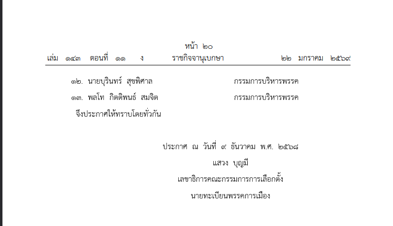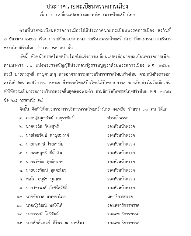 ตามที่นายทะเบียนพรรคการเมืองได้มีประกาศนายทะเบียนพรรคการเมือง ลงวันที่ ๘ ธันวาคม ๒๕๖๘ เรื่อง การเปลี่ยนแปลงกรรมการบริหารพรรคไทยสร้างไทย มีคณะกรรมการบริหารพรรคไทยสร้างไทย จำนวน ๓๕ คน นั้น