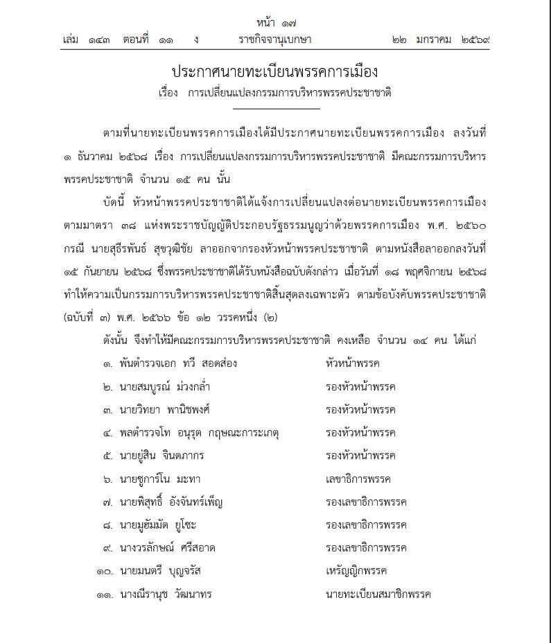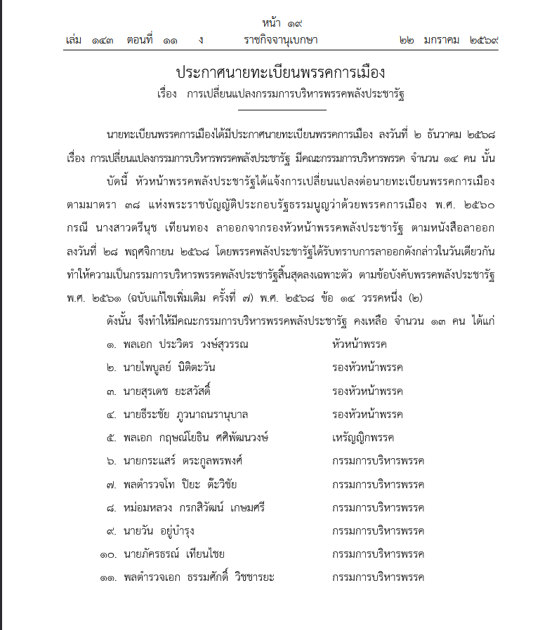 บัดนี้ หัวหน้าพรรคพลังประชารัฐได้แจ้งการเปลี่ยนแปลงต่อนายทะเบียนพรรคการเมือง ตามมาตรา ๓๘ แห่งพระราชบัญญัติประกอบรัฐธรรมนูญว่าด้วยพรรคการเมือง พ.ศ. ๒๕๖๐ กรณี นางสาวตรีนุช เทียนทอง ลาออกจากรองหัวหน้าพรรคพลังประชารัฐ ตามหนังสือลาออก ลงวันที่ ๒๘ พฤศจิกายน ๒๕๖๘ โดยพรรคพลังประชารัฐได้รับทราบการลาออกดังกล่าวในวันเดียวกัน ทำให้ความเป็นกรรมการบริหารพรรคพลังประชารัฐสิ้นสุดลงเฉพาะตัว ตามข้อบังคับพรรคพลังประชารัฐ พ.ศ. ๒๕๖๑ (ฉบับแก้ไขเพิ่มเติม ครั้งที่ ๗) พ.ศ. ๒๕๖๘ ข้อ ๑๔ วรรคหนึ่ง (๒) ดังนั้น จึงทำให้มีคณะกรรมการบริหารพรรคพลังประชารัฐคงเหลือ จำนวน ๑๓ คน ได้แก่