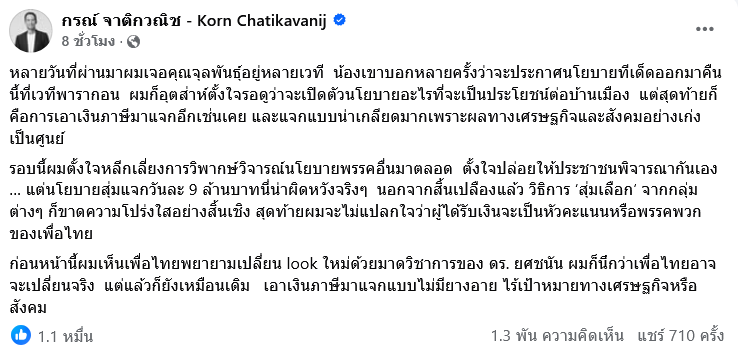 รอบนี้ผมตั้งใจหลีกเลี่ยงการวิพากษ์วิจารณ์นโยบายพรรคอื่นมาตลอด ตั้งใจปล่อยให้ประชาชนพิจารณากันเอง แต่นโยบายสุ่มแจกวันละ 9 ล้านบาทนี่น่าผิดหวังจริง ๆ นอกจากสิ้นเปลืองแล้ว วิธิการ สุ่มเลือก จากกลุ่มต่าง ๆ ก็ขาดความโปร่งใสอย่างสิ้นเชิง สุดท้ายผมจะไม่แปลกใจว่าผู้ได้รับเงินจะเป็นหัวคะแนนหรือพรรคพวกของเพื่อไทย