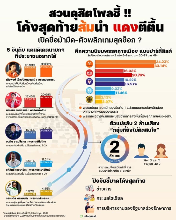 อ้างอิงข้อมูลจาก สวนดุสิตโพล สำรวจความคิดเห็นประชาชนทั่วประเทศจากกลุ่มตัวอย่างจำนวน 2,269 คน รอบระหว่างวันที่ 20-23 มกราคม 69 ทั้งแบบออนไลน์และภาคสนาม