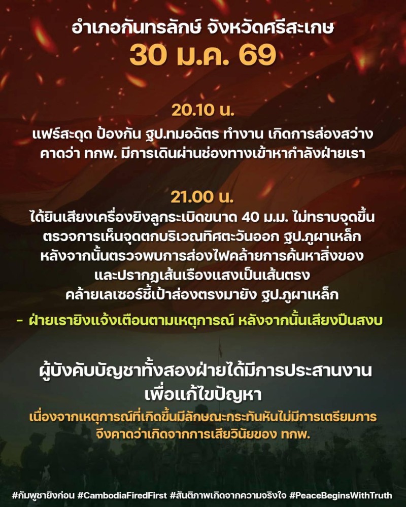 เมื่อช่วงดึกของวันที่ 30 มกราคม 2569 ที่ผ่านมา ศูนย์ประชาสัมพันธ์กองทัภาคที่ 2 อัปเดต สถานการณ์ชายแดนไทย - กัมพูชา ผ่านเพจเฟซบุ๊ก กองทัพภาคที่ 2 โดยระบุว่า ที่อำเภอกันทรลักษ์ จังหวัดศรีสะเกษ 30 ม.ค. 69 เมื่อเวลา 20.10 น. แฟร์สะดุด ป้องกัน ฐป.ทมอฉัตร ทำงาน เกิดการส่องสว่าง คาดว่า ทกพ. มีการเดินผ่านช่องทางเข้าหากำลังฝ่ายเรา
