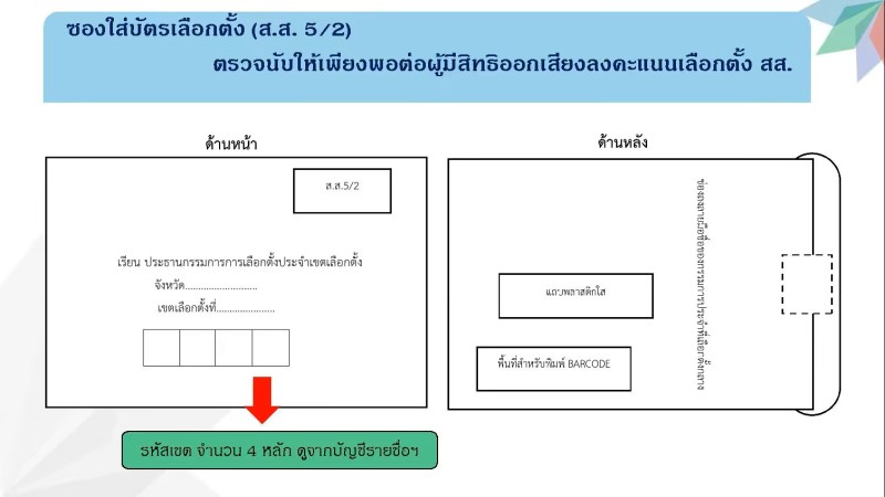 กกต.จึงขอเน้นย้ำให้ผู้มีสิทธิเลือกตั้งตรวจสอบข้อมูลที่อยู่บนหน้าซองใส่บัตรเลือกตั้ง หรือ ส.ส.5/2 อย่างละเอียด ว่าชื่อจังหวัด เขตเลือกตั้ง และรหัสเขตเลือกตั้งซึ่งเป็นตัวเลข 4 หลัก ตรงกับข้อมูลของผู้มีสิทธิเลือกตั้งหรือไม่
