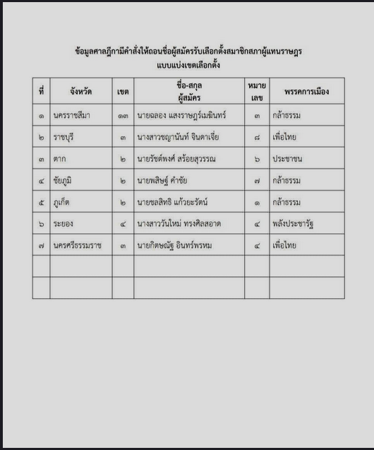 จากข้อมูลล่าสุด ศาลฎีกาได้มีคำสั่งให้ถอนชื่อผู้สมัครรับเลือกตั้ง สส.แบบแบ่งเขตเลือกตั้ง ตามที่ ผอ.การเลือกตั้งประจำเขตเลือกตั้ง พบว่าผู้สมัครใดขาดคุณสมบัติหรือมีลักษณะต้องห้าม ดังนี้