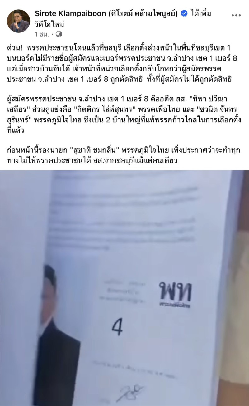 วันที่ 1 ก.พ. 2569 นายศิโรตม์ คล้ามไพบูลย์ โพสต์เฟซบุ๊ก ระบุว่า ด่วน! พรรคประชาชนโดนโกงที่ชลบุรี เลือกตั้งล่วงหน้าในพื้นที่ชลบุรี เขต 1 บนบอร์ดไม่มีรายชื่อผู้สมัครและเบอร์พรรคประชาชน