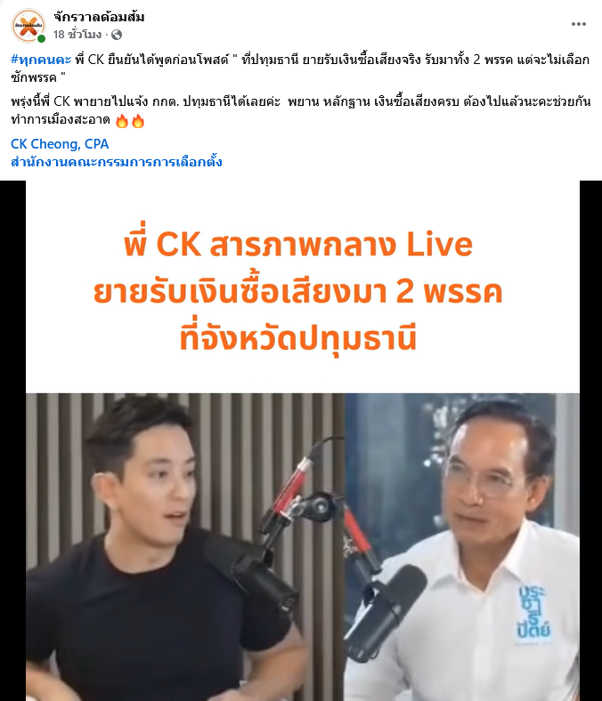 เมื่อวันที่ 3 กุมภาพันธ์ 2569 ที่ผ่านมา เพจเฟซบุ๊ก จักรวาลด้อมส้ม ได้ออกมาเผยเเพร่คลิป ขณะที่ ซีเค กำลังร่วมรายการอยู่กับ กรณ์ จาติกวณิช แคนดิเดตนายกฯ คนที่ 2 พรรคประชาธิปัตย์ พร้อมกับระบุข้อความว่า ทุกคนคะ พี่ CK ยืนยันได้พูดก่อนโพสต์ ที่ปทุมธานี ยายรับเงินซื้อเสียงจริง รับมาทั้ง 2 พรรค แต่จะไม่เลือกสักพรรค พรุ่งนี้พี่ CK พายายไปแจ้ง กกต. ปทุมธานีได้เลยค่ะ พยาน หลักฐาน เงินซื้อเสียงครบ ต้องไปแล้วนะคะช่วยกันทำการเมืองสะอาด