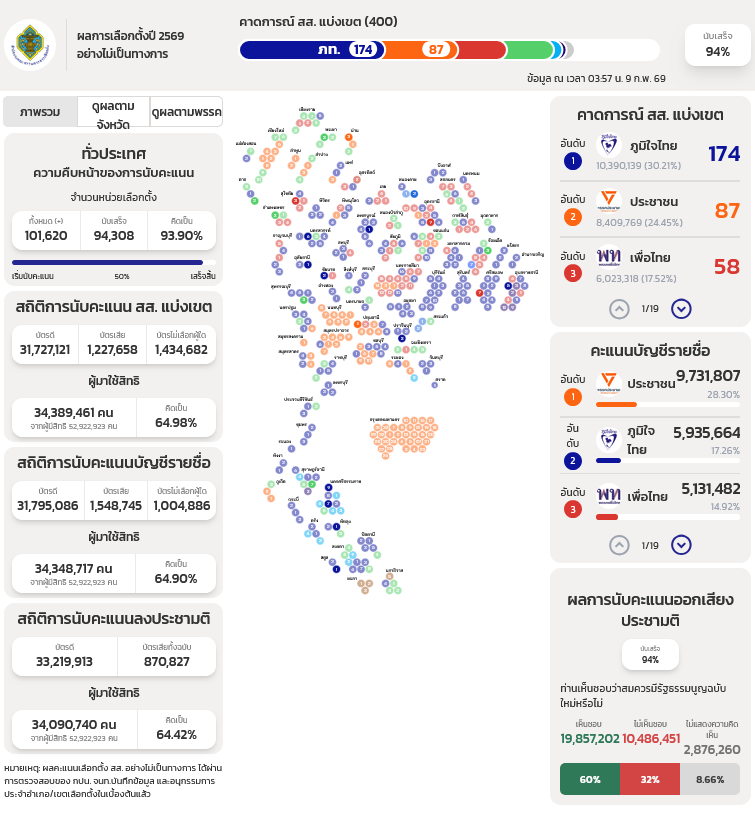 วันที่ 9 กุมภาพันธ์ 2569 คณะกรรมการการเลือกตั้ง (กกต.) ประกาศผลการเลือกตั้งปี 2569 ผ่านระบบ ectreport69 อย่างไม่เป็นทางการ ข้อมูล ณ เวลา 03:57 นับเสร็จ 94 เปอร์เซ็นต์
