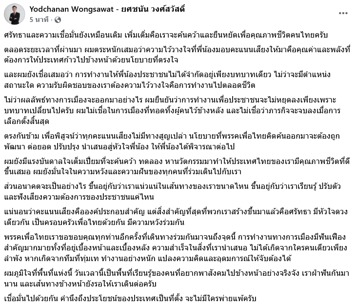 ตลอดระยะเวลาที่ผ่านมา ผมตระหนักเสมอว่าความไว้วางใจที่พี่น้องมอบคะแนนเสียงให้มาคือคุณค่าและพลังที่ต้องการให้ประเทศก้าวไปข้างหน้าด้วยนโยบายที่ตรงใจ และผมยังเชื่อเสมอว่า การทำงานให้พี่น้องประชาชนไม่ได้จำกัดอยู่เพียงบทบาทเดียว ไม่ว่าจะมีตำแหน่ง สถานะใด ความรับผิดชอบของเราต้องความไว้วางใจคือการทำงานไปตลอดชีวิต ไม่ว่าผลลัพธ์ทางการเมืองจะออกมาอย่างไร ผมยืนยันว่าการทำงานเพื่อประชาชนจะไม่หยุดลงเพียงเพราะบทบาทเปลี่ยนไปครับ ผมไม่เชื่อในการเมืองที่ทอดทิ้งผู้คนไว้ข้างหลัง และไม่เชื่อว่าภารกิจจะจบลงเมื่อการเลือกตั้งสิ้นสุด ตรงกันข้าม เพื่อพิสูจน์ว่าทุกคะแนนเสียงไม่มีทางสูญเปล่า นโยบายที่พรรคเพื่อไทยคิดค้นออกมาจะต้องถูกพัฒนา ต่อยอด ปรับปรุง นำเสนอสู่หัวใจพี่น้อง ให้พี่น้องได้พิจารณาต่อไป