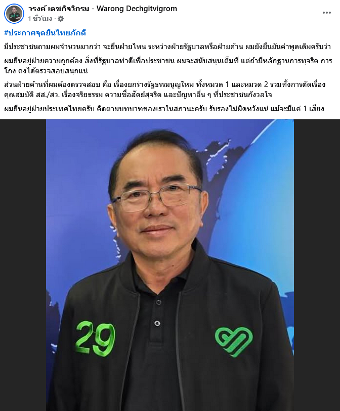 ส่วนฝ่ายค้านที่ผมต้องตรวจสอบ คือ เรื่องยกร่างรัฐธรรมนูญใหม่ ทั้งหมวด 1 และหมวด 2 รวมทั้งการตัดเรื่องคุณสมบัติ สส./สว. เรื่องจริยธรรม ความซื่อสัตย์สุจริต และปัญหาอื่น ๆ ที่ประชาชนกังวลใจ ผมยืนอยู่ฝ่ายประเทศไทยครับ ติดตามบทบาทของเราในสภานะครับ รับรองไม่ผิดหวังแน่ แม้จะมีแค่ 1 เสียง