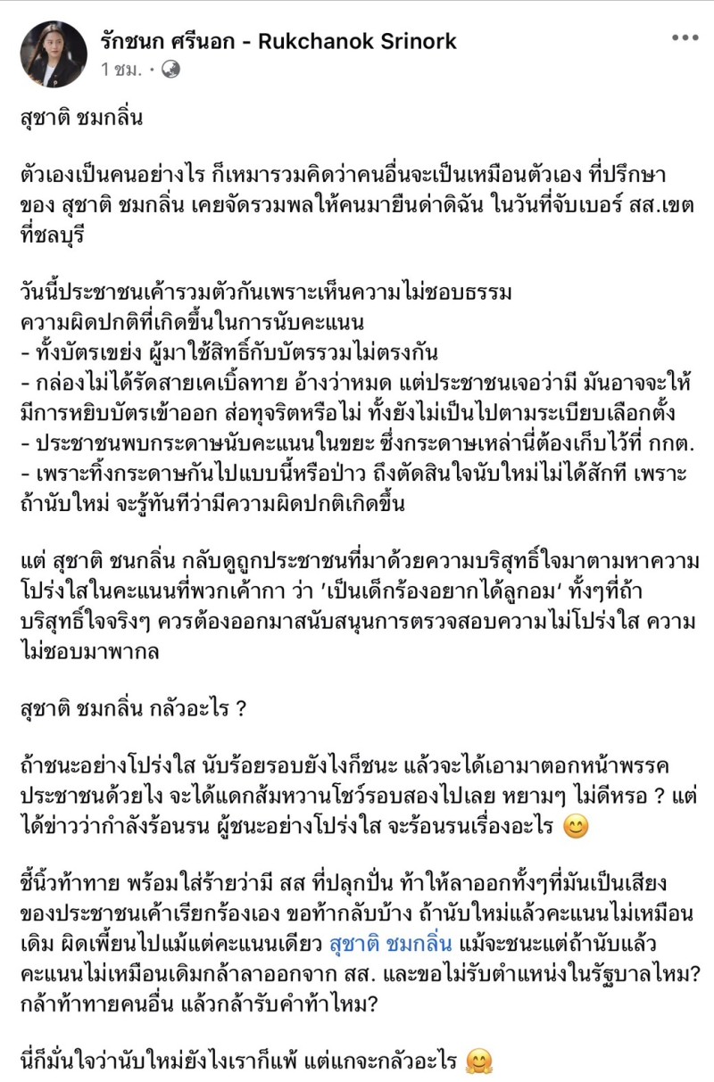 ในวันที่ 10 กุมภาพันธ์ 2569 นางสาวรักชนก ศรีนอก ผู้สมัครบัญชีรายชื่อ พรรคประชาชน โพสต์ข้อความตอบโต้กรณีชาวบ้านชลบุรี เขต 1 รวมตัวเรียกร้องให้ กกต.นับคะแนนใหม่ หลังถูกกล่าวหาว่าถูกปลุกปั่น
