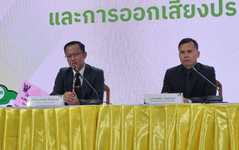 ที่สำนักงานคณะกรรมการการเลือกตั้ง ว่าที่ ร.ต.ภาสกร สิริภคยาพร รองเลขาธิการ กกต. พร้อมด้วย นายครรชิต เจริญอินทร์ ร่วมแถลงชี้แจงกระแสเรียกร้องให้นับคะแนนใหม่ หลายพื้นที่ โดยเฉพาะ ชลบุรี เขตเลือกตั้งที่ 1