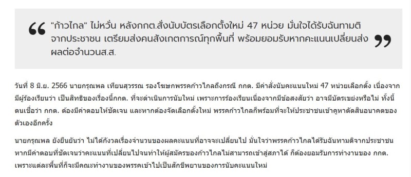 ทั้งนี้ เพจ นักกฎหมายจอมป่วน ยังได้โพสต์ข่าวเกี่ยวกับกรณีที่ กกต.สั่งนับคะแนนใหม่หลังการเลือกตั้งปี 2566 พร้อมระบุข้อความ ปี 66 ที่ก้าวไกลชนะเลือกตั้ง กกต.สั่งนับคะแนนใหม่เอง 47 หน่วย อย่าตอแหล อย่าบิดเบือน ผ่านมา 2 ปีเองนะ ใครจะไปลืม