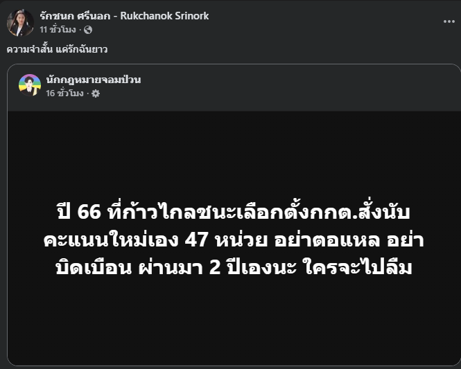 วันที่ 10 กุมภาพันธ์ 2569 น.ส.รักชนก ศรีนอก ได้แชร์โพสต์จากเพจ นักกฎหมายจอมป่วน ผ่านสื่อสังคมออนไลน์ โดยมีเนื้อหาเกี่ยวกับการเลือกตั้งทั่วไปปี 2566 ซึ่งพรรคก้าวไกลเป็นผู้ชนะการเลือกตั้ง