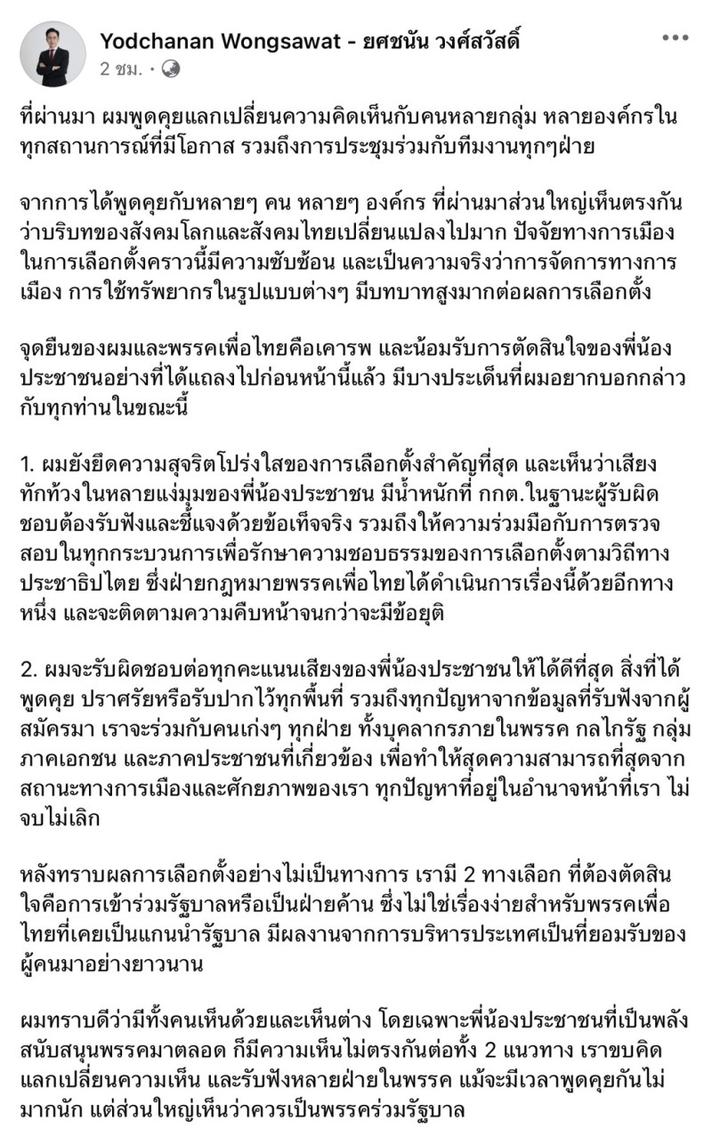 วันนี้ 14 กุมภาพันธ์ 2569 นาย ยศชนัน วงศ์สวัสดิ์ แคนดิเดตนายกรัฐมนตรี ออกมาโพสต์ชี้แจงท่าทีทางการเมืองเป็นครั้งแรก หลัง พรรคเพื่อไทย ตัดสินใจเข้าร่วมรัฐบาล ยืนยันชัด พรรคเคารพเสียงประชาชน ยึดความสุจริตโปร่งใสของการเลือกตั้งเป็นหลัก พร้อมติดตามการตรวจสอบทุกประเด็นจนถึงที่สุด