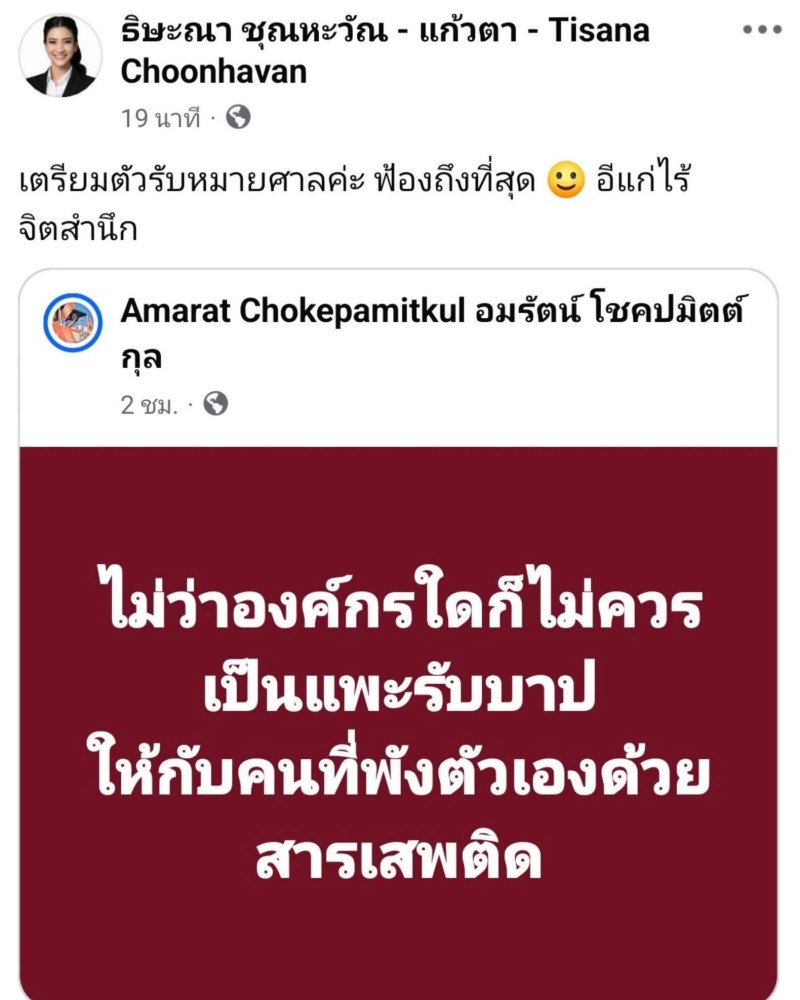 ต่อมา นางสาวธิษะณาได้แชร์โพสต์ของนางอมรัตน์ พร้อมระบุข้อความว่า เตรียมตัวรับหมายศาลค่ะ ฟ้องถึงที่สุด อีแก่ไร้จิตสำนึก