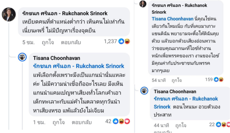 โดยนางสาวรักชนกได้คอมเมนต์ว่า เหยียดคนที่ตำแหน่งต่ำกว่า เห็นคนไม่เท่ากันเนี่ยนะพี่ ไม่มีปัญหาเรื่องจุดยืน ด้านนางสาวธิษะณาตอบกลับว่า แพ้เลือกตั้งเพราะ xx เป็นแกนนำนั่นแหละค่ะ ไม่มีความน่าเชื่อถืออะไรเลย เห็นแกนนำแคมเปญหาเสียงทั่วโลกเขาเอาเด็กทะเลาะกับแม่ค้าในตลาดทุกวันนำหาเสียงเหรอ แพ้แล้วยังไม่เจียม