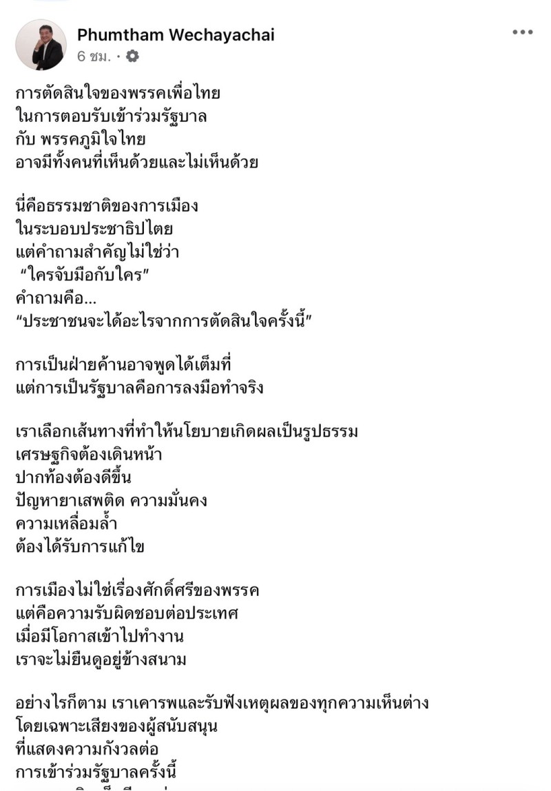 ในวันที่ 15 กุมภาพันธ์ นาย ภูมิธรรม เวชยชัย แกนนำพรรค พรรคเพื่อไทย ออกมาโพสต์ชี้แจงตรงไปตรงมาหลังตัดสินใจเข้าร่วมรัฐบาล กับพรรค พรรคภูมิใจไทย