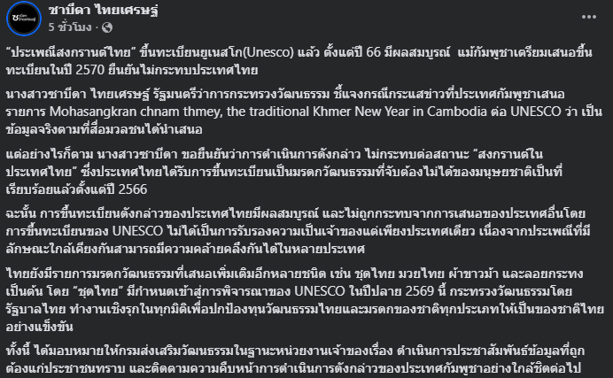 14 กุมภาพันธ์ 2569 ที่ผ่านมา นางสาวซาบีดา ไทยเศรษฐ์ รัฐมนตรีว่าการกระทรวงวัฒนธรรม ชี้แจงที่กระทรวงวัฒนธรรม กรณีกระแสข่าวประเทศกัมพูชาเสนอรายการ Mohasangkran chnam thmey, the traditional Khmer New Year in Cambodia ต่อ UNESCO ว่าเป็นข้อมูลจริงตามที่สื่อมวลชนนำเสนอ