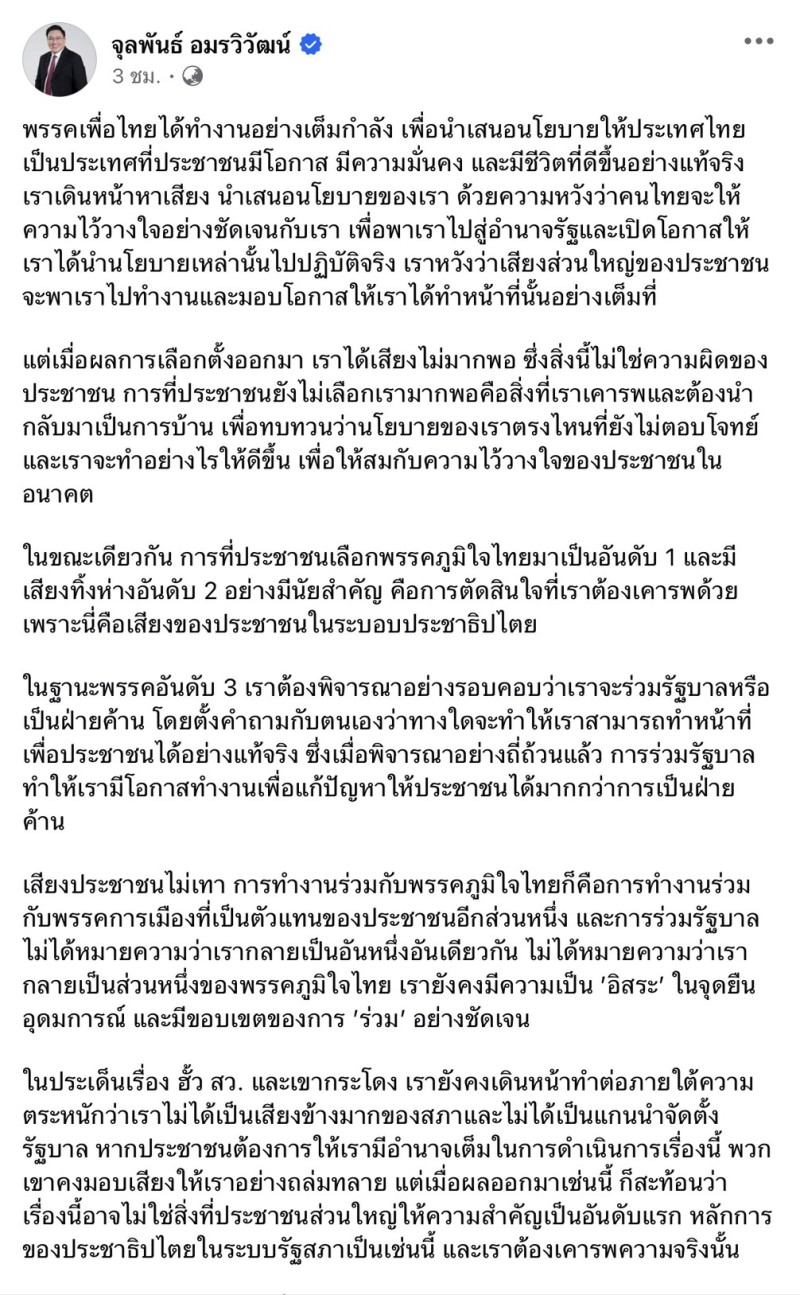 ในวันที่ 15 กุมภาพันธ์ นาย จุลพันธ์ อมรวิวัฒน์ แกนนำพรรคเพื่อไทย โพสต์ชี้แจงเหตุผลสำคัญ หลังพรรคต้องตัดสินใจเข้าร่วมรัฐบาล