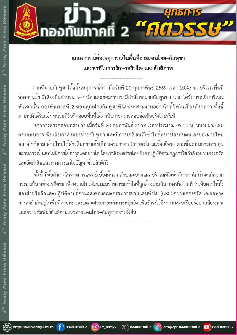 จากการตรวจสอบทราบว่า เมื่อวันที่ 20 กุมภาพันธ์ 2569 เวลาประมาณ 09.30 น. หน่วยฝ่ายไทยตรวจพบการเพิ่มเติมกำลังของฝ่ายกัมพูชา และมีการเคลื่อนที่เข้าใกล้แนวป้องกันตนเองของฝ่ายไทย อย่างไรก็ตาม ฝ่ายไทยได้ดำเนินการแจ้งเตือนด้วยวาจา (การตะโกนแจ้งเตือน) ตามขั้นตอนการควบคุมสถานการณ์ และไม่มีการใช้อาวุธแต่อย่างใด โดยกำลังพลฝ่ายไทยยังคงปฏิบัติตามกฎการใช้กำลังอย่างเคร่งครัด และยึดมั่นในแนวทางการแก้ไขปัญหาด้วยสันติวิธี