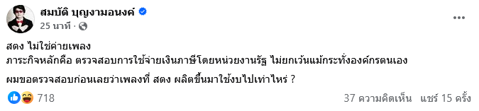 ล่าสุดนายสมบัติ บุญงามอนงค์ หรือ บก.ลายจุด นักเคลื่อนไหวทางสังคมและนักการเมือง ที่รู้จักในนามผู้ก่อตั้ง มูลนิธิกระจกเงา ได้ออกมาเคลื่อนไหวต่อประเด็นร้อนดังกล่าว โดยโพสต์ข้อความผ่านเฟซบุ๊กส่วนตัว สมบัติ บุญงามอนงค์ โดยระบุว่า สตง. ไม่ใช่ค่ายเพลง ภาระกิจหลักคือ ตรวจสอบการใช้จ่ายเงินภาษีโดยหน่วยงานรัฐ ไม่ยกเว้นแม้กระทั่งองค์กรตนเอง ผมขอตรวจสอบก่อนเลยว่าเพลงที่ สตง. ผลิตขึ้นมาใช้งบไปเท่าไหร่