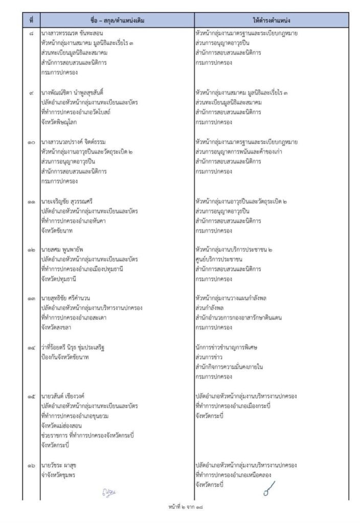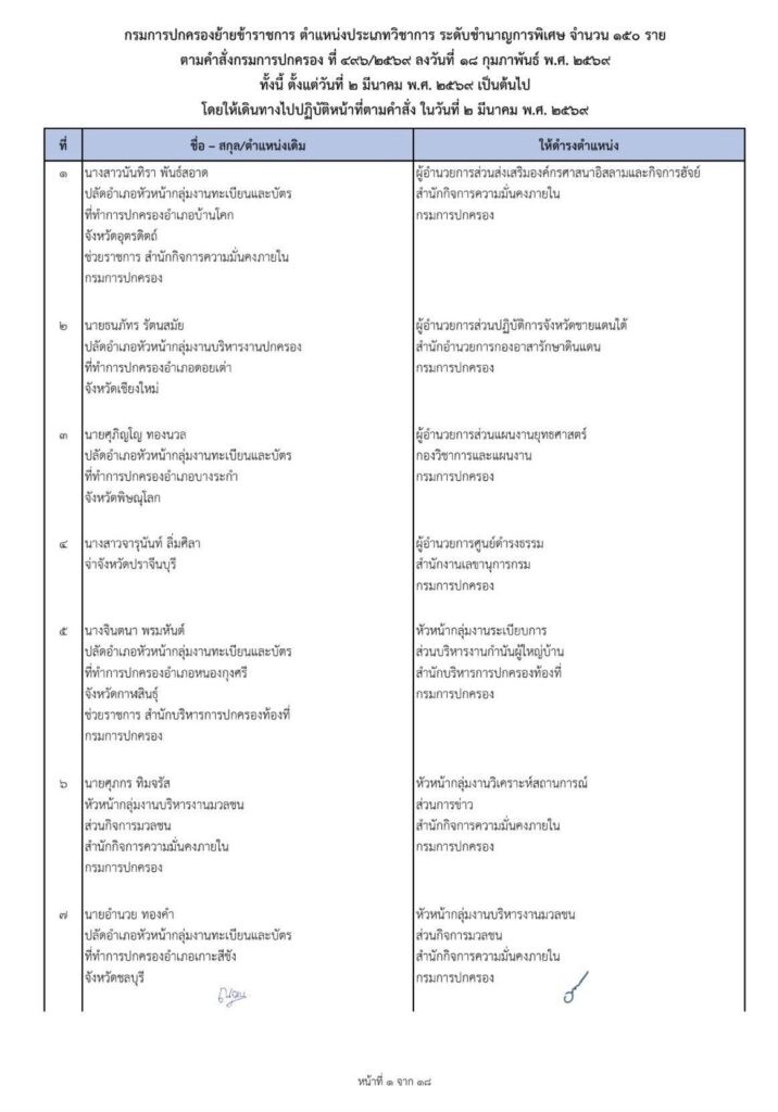 เมื่อวันที่ 21 กุมภาพันธ์ 2569 กรมการปกครอง ได้มีคำสั่งย้ายข้าราชการ ประเภทวิชาการ ระดับชำนาญการพิเศษ จำนวน 150 ราย โดยให้เดินทางไปปฏิบัติหน้าที่ตามคำสั่ง ในวันที่ 2 มีนาคม 2569