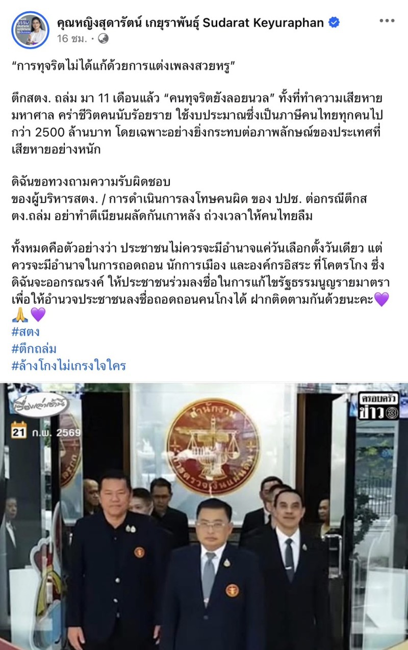 ล่าสุด คุณหญิง สุดารัตน์ เกยุราพันธุ์ อดีตหัวหน้าพรรคไทยสร้างไทย ออกมาฟาดแรงแบบไม่ไว้หน้า ย้ำชัดว่า “การทุจริต ไม่ได้แก้ด้วยการแต่งเพลงสวยหรู” คุณหญิงสุดารัตน์ตั้งคำถามตรงไปที่ผู้บริหาร สตง. กรณี ตึก สตง. ถล่ม ผ่านไป 11 เดือน สร้างความเสียหายกว่า 2,500 ล้านบาท คร่าชีวิตประชาชนจำนวนมาก แต่จนถึงวันนี้ คนทุจริตยังลอยนวล