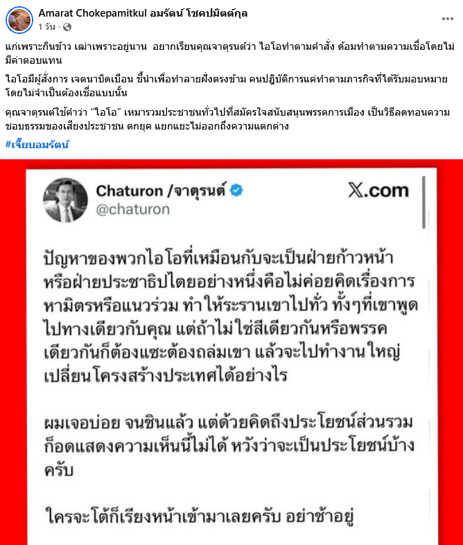 ล่าสุด ด้าน อมรัตน์ โชคปมิตต์กุล อดีตสมาชิกสภาผู้แทนราษฎร (ส.ส.) แบบบัญชีรายชื่อ ของพรรคก้าวไกล ได้ออกมาโพสต์ข้อความตอบกลับประเด็นดังกล่าว ด้วยการโพสต์ข้อความ ผ่านบัญชีเฟซบุ๊ก Amarat Chokepamitkul อมรัตน์ โชคปมิตต์กุล โดยระบุว่า แก่เพราะกินข้าว เฒ่าเพราะอยู่นาน อยากเรียนคุณจาตุรนต์ว่า ไอโอทำตามคำสั่ง ด้อมทำตามความเชื่อโดยไม่มีค่าตอบแทน ไอโอมีผู้สั่งการ เจตนาบิดเบือน ชี้นำเพื่อทำลายฝั่งตรงข้าม คนปฎิบัติการแค่ทำตามภารกิจที่ได้รับมอบหมายโดยไม่จำเป็นต้องเชื่อแบบนั้น