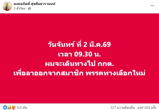 วันจันทร์ที่ 2 มี.ค.69 เวลา 09.30 น. ผมจะเดินทางไป กกต. เพื่อลาออกจากสมาชิก พรรคทางเลือกใหม่